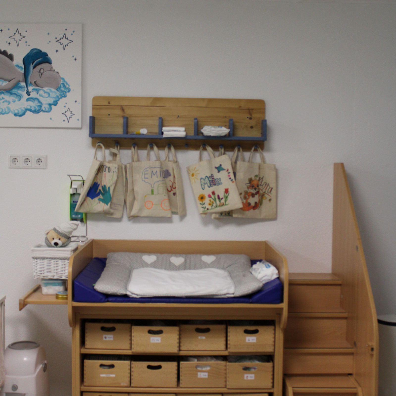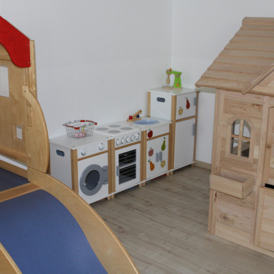 Die Räume sind an die Bedürfnisse der Kinder angepasst. Der Waschbereich bietet mit niedrigem Waschbecken und einer Kindertoiletten die Möglichkeit, dem immer grösser werdenden Drang nach Selbstständigkeit nachzugehen.